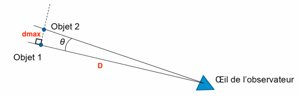 Angle minimal à partir duquel notre œil peut distinguer deux objets très proches : $\varepsilon=2,9\times {10}^{-4}\ rad$.