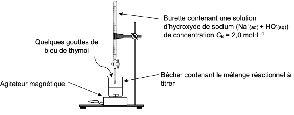 - verser la totalité du mélange réactionnel dans une bécher de 250 mL et procéder alors au titrage de l’acide éthanoïque restant comme schématisé ci-après.