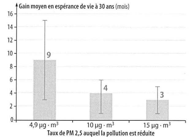 Des chercheurs ont estimé, au moyen de modèles mathématiques, les conséquences de la réduction des émissions de particules fines de moins de 2,5 mm (notées PM 2,5) sur la surmortalité et l’espérance de vie, selon trois scénarios :