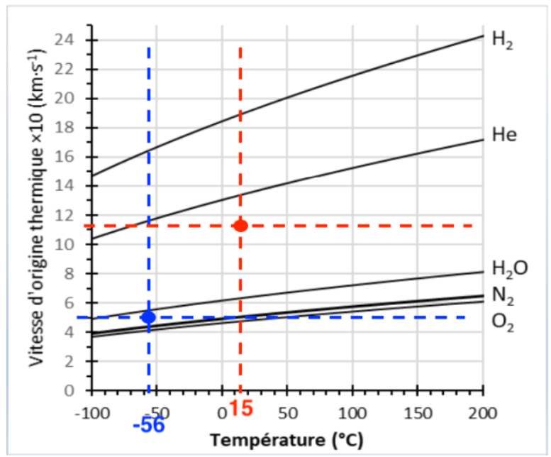 « Pour déterminer si un astre peut retenir une atmosphère, placer sur le graphique un point dont les coordonnées sont la température moyenne de surface de l’astre en abscisse et la vitesse de libération sur l’astre en ordonnée. Si le point tracé est au-dessus de la courbe associée à une entité chimique, alors l’astre est capable de retenir une atmosphère contenant cette entité ».