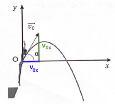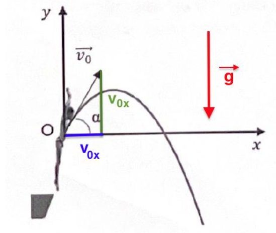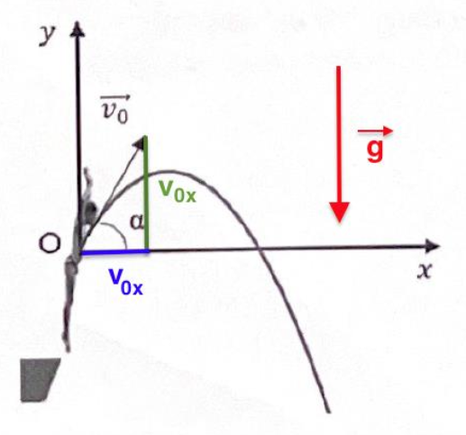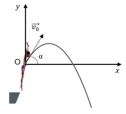 Lors du saut, le plongeur se propulse et acquiert ainsi une vitesse initiale à la date t = 0 caractérisée par le vecteur vitesse initiale $\overrightarrow{v_0}$ incliné d’un angle 𝛼 avec l’horizontale.