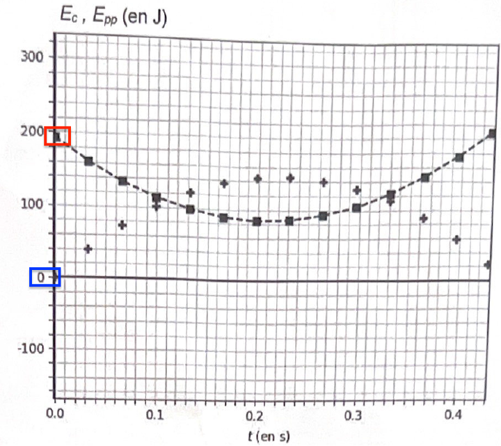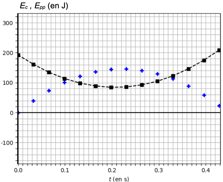 Pour $t\le0,4\ s$ l’énergie mécanique est constante, les forces de frottements sont négligeables.