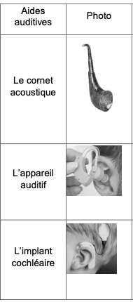 Le cornet acoustique, l’appareil auditif et l’implant cochléaire sont des aides auditives qui permettent de pallier certains dysfonctionnements de l’oreille empêchant d’entendre les sons.