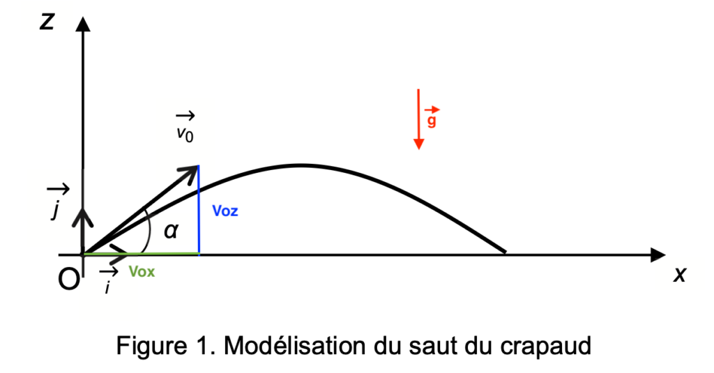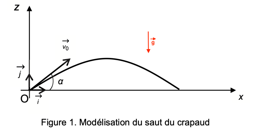 Le mouvement du centre de masse G du crapaud est étudié dans le référentiel terrestre supposé galiléen et muni du système d’axes (Ox, Oz), respectivement horizontal muni du vecteur unitaire $\overrightarrow{i}$ et vertical muni du vecteur unitaire $\overrightarrow{j}$ (voir figure 1).