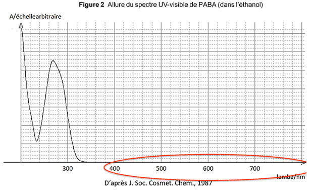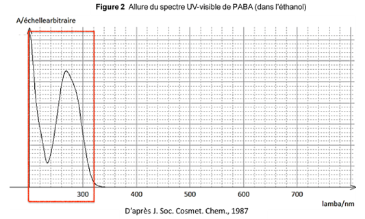 Le rayonnement solaire qui atteint la Terre est composé de rayonnements infrarouges, de lumière visible et de rayonnements ultraviolets potentiellement nocifs, comme l’indique le tableau ci-après. Les crèmes de protection solaire qui contiennent des substances actives appelées filtres organiques agissent par absorption d’une partie des rayonnements ultraviolets. Le PABA est le plus ancien filtre organique. Utilisé dès le début des années 70 dans les crèmes solaires, il est résistant à l’eau et la transpiration. Cependant, en raison de son instabilité au soleil et de son potentiel allergisant, il a été peu à peu abandonné.