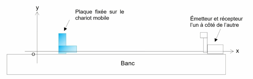 Le chariot mobile se déplace horizontalement le long du banc, dans le référentiel terrestre supposé galiléen.