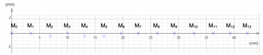Le pointage à intervalles de temps réguliers d’un point du chariot, matérialisé par le « + » (figure 6), est réalisé afin d’obtenir la trajectoire du chariot (figure 7).