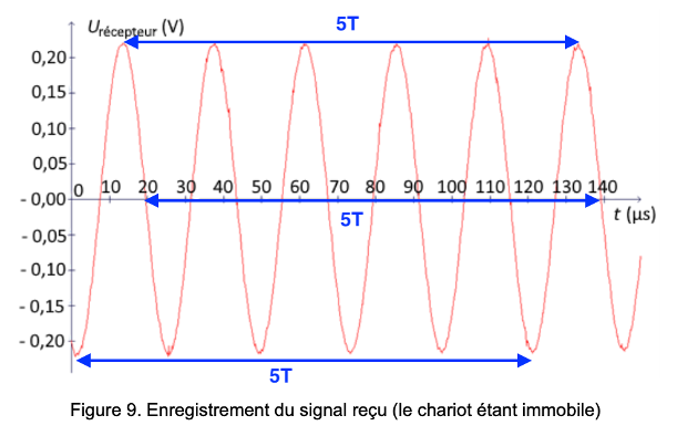 Le signal reçu par le récepteur d’ondes ultrasonores lorsque le chariot reste immobile est enregistré. La courbe obtenue de la tension aux bornes du récepteur en fonction du temps est représentée ci-dessous (figure 9).