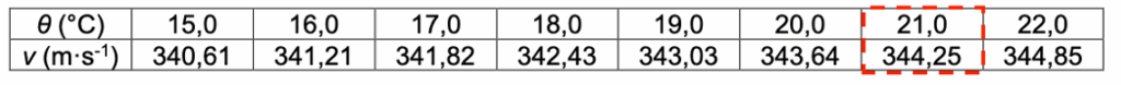 Pour $\theta=21,0^{\circ}\mathrm{C}$, on lit sur le tableau : $v = 344,25\ \mathrm{m·s^{-1}}$