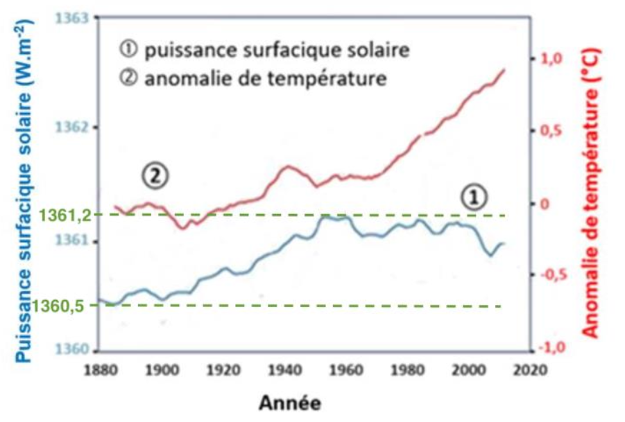 Entre 1900 et 1960 la puissance surfacique solaire reçue par la planète augmente. Depuis 1960 la puissance surfacique solaire reçue par la planète est presque constante.