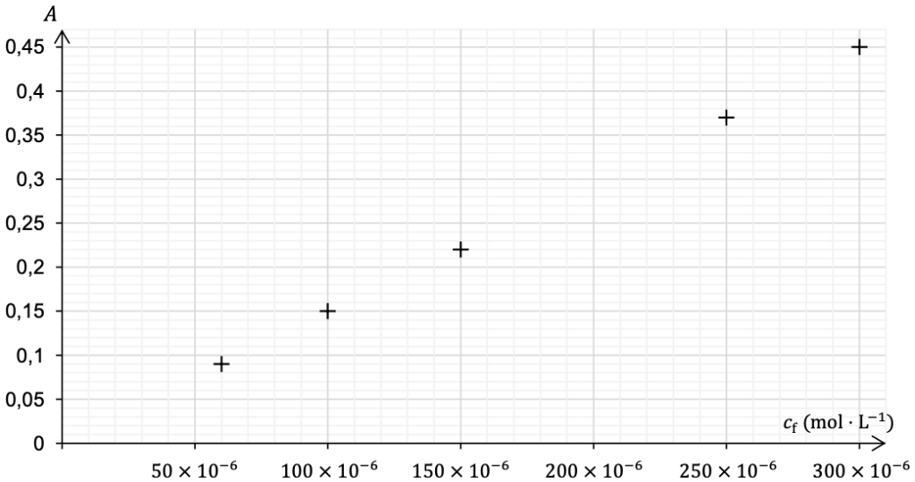 Pour tracer la courbe d’étalonnage, cinq solutions étalons sont préparées à partir d’une solution mère S0 ayant une concentration en ions nitrite : 𝑐0 = 3,0 × 10−3 mol ⋅ L−1. Les concentrations 𝑐f des solutions étalons sont indiquées dans le tableau ci-après.