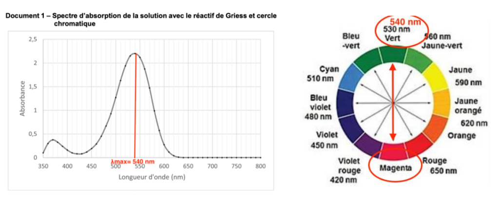 Document 1 – Spectre d’absorption de la solution avec le réactif de Griess et cercle chromatique