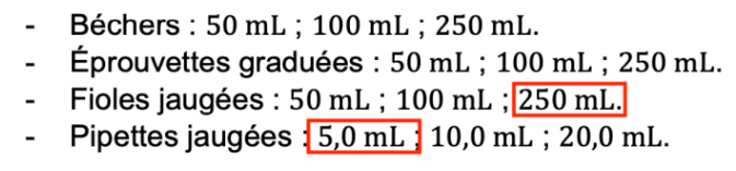 - Fioles jaugées : 50 mL ; 100 mL ; 250 mL.