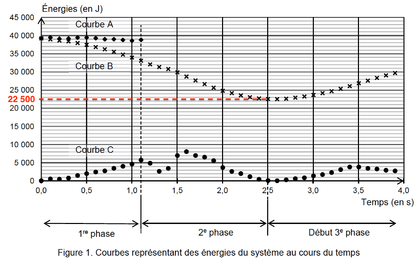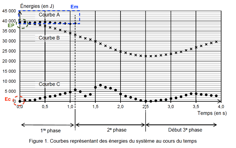 6.1. Identifier parmi les courbes A, B, C de la figure 1 celle représentant l’énergie cinétique, celle représentant l’énergie potentielle de pesanteur et celle représentant l’énergie mécanique. Justifier ces choix.