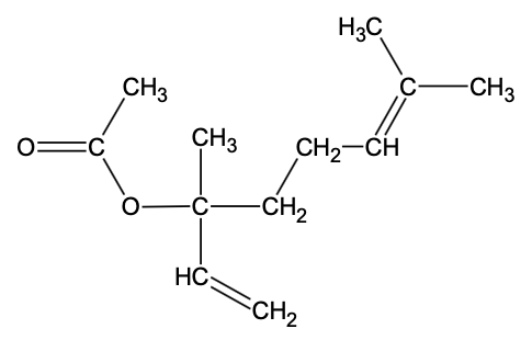 Q1. Représenter la formule topologique de l’éthanoate de linalyle, puis entourer le groupe caractéristique de cette molécule et nommer la famille fonctionnelle correspondante.