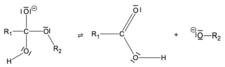 L’une des principales applications de l’hydrolyse basique d’un ester est la synthèse des savons. L’hydrolyse basique d’un ester est une transformation chimique, lente et totale, au cours de laquelle un alcool et un ion carboxylate sont obtenus par réaction entre un ester et un ion hydroxyde OH–. Le mécanisme de cette réaction se décompose en trois étapes présentées ci-dessous, où R1 et R2 représentent des chaînes carbonées :