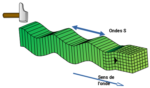 Les ondes S sont aussi appelées ondes transversales. À leur passage, les perturbations du sol s’effectuent perpendiculairement au sens de propagation de l’onde. Les ondes S ne se propagent que dans les milieux solides.
