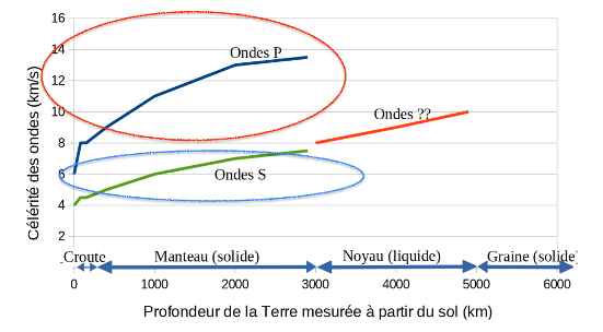 Graphe : célérité des différents types d’onde dans la structure terrestre