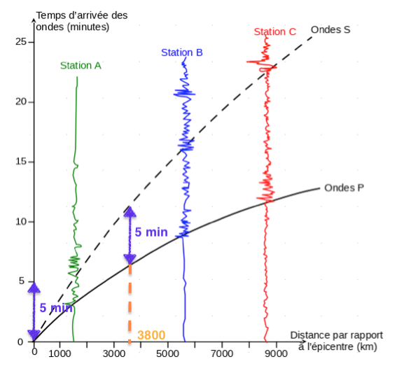 4. Déterminer si l’allure du sismogramme fourni (annexe 1) est cohérente avec les informations du graphe précédent.
