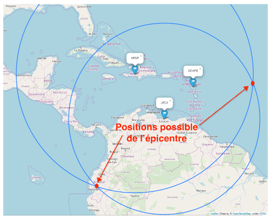 Pour déterminer graphiquement la position de l’épicentre, on a utilisé un programme informatique en langage Python. Ce programme permet de créer un fond de carte, de positionner les trois stations LFCV, HPAP et GCAPE, de tracer des cercles dont les centres sont les stations. La carte produite figure dans le document en annexe 2 à rendre avec la copie.