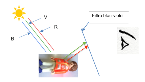 Le filtre de couleur bleu-violet ne laisse passer que le bleu-violet. Or la couleur de la veste est la couleur complémentaire du bleu-violet.