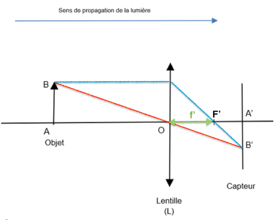 2.1. Sans souci d’échelle compléter le schéma 2 de l’annexe à rendre avec la copie, en plaçant les rayons lumineux issus de B et permettant de positionner précisément le point B’ (image de B à travers la lentille), le foyer image F ’ ainsi que la distance focale f’ = $\overline{OF’}$.