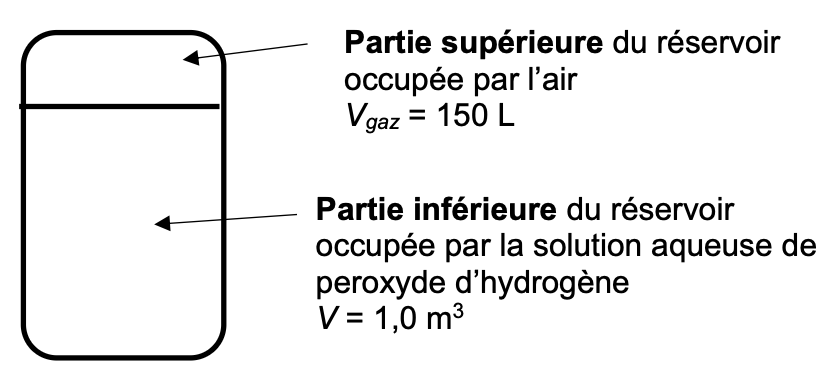 En 2015, un accident a eu lieu dans une usine agroalimentaire qui utilise une solution de peroxyde d’hydrogène pour désinfecter la ligne de production. Selon l’inspection des installations classées, l’explosion serait due à une surpression dans le réservoir de stockage de la solution de peroxyde d’hydrogène. Plusieurs pistes sont envisagées pour expliquer la cause de l’accident, parmi lesquelles une réaction violente générée par une impureté présente dans le réservoir de stockage liée au changement de capteur de pression du réservoir effectué 15 jours auparavant. La solution aqueuse de peroxyde d’hydrogène stockée dans ce réservoir a une concentration [H2O2]réservoir = 1,2 mol∙L-1.