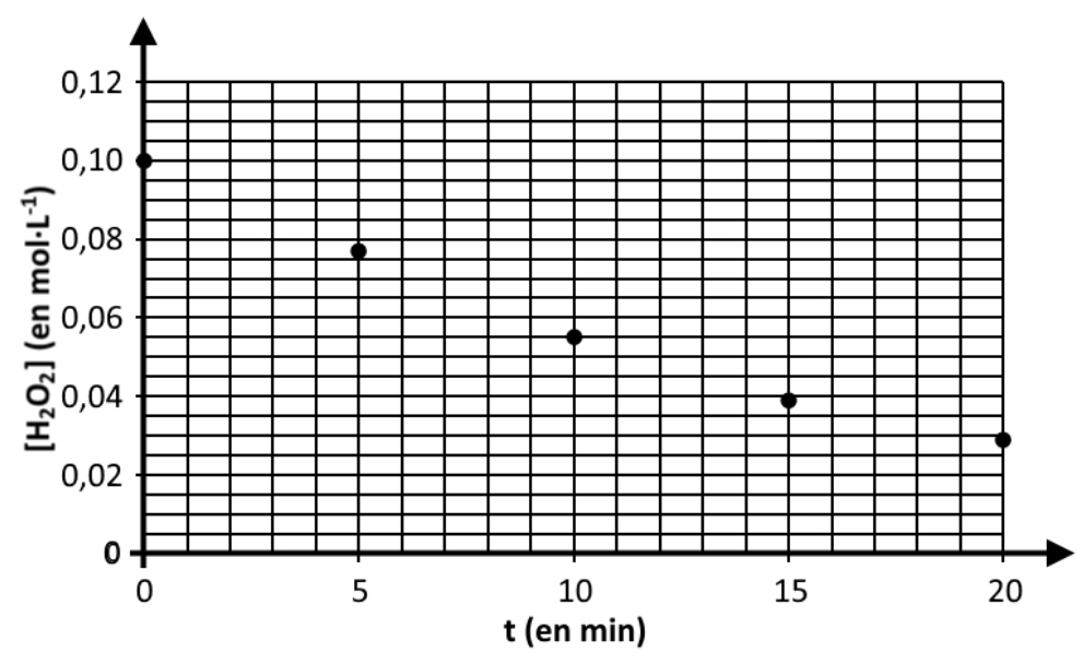 Le peroxyde d’hydrogène présent dans la solution S se décompose selon la réaction d’équation 1 après ajout des ions Fe3+. Le suivi de l’évolution temporelle de la concentration en H2O2 est réalisé par titrages successifs aux dates 5, 10, 15 et 20 minutes.