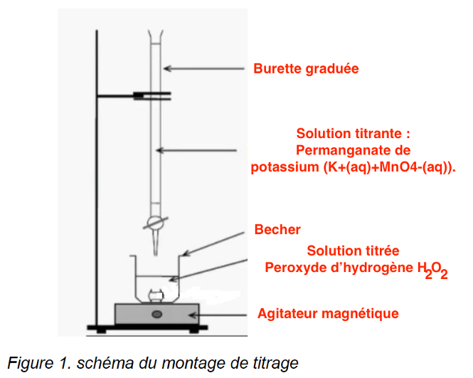 Pour suivre l’évolution temporelle de la concentration en peroxyde d’hydrogène H2O2, la quantité de matière de H2O2 restante à différentes dates est déterminée à partir de titrages colorimétriques successifs par les ions permanganate MnO4– (aq) présents dans une solution de permanganate de potassium (K+(aq)+MnO4– (aq)). La réaction d’oxydoréduction support de titrage a pour équation :