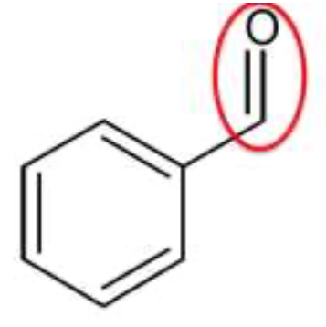 1.1. Recopier la formule topologique du benzaldéhyde, entourer le groupe caractéristique et nommer la famille fonctionnelle correspondante.