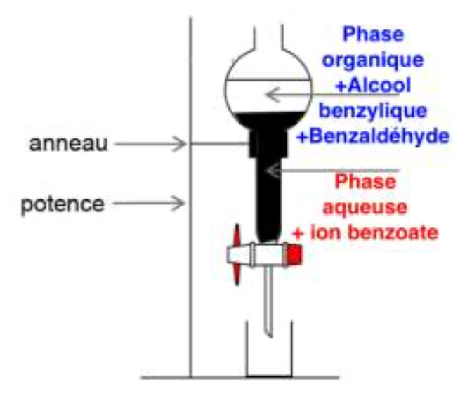 En fin de réaction, on verse le contenu du ballon dans une ampoule à décanter et on réalise une extraction liquide-liquide en utilisant de l’éther diéthylique comme solvant extracteur. Après décantation, on distingue une phase aqueuse et une phase organique non-miscibles que l’on sépare l’une de l’autre.