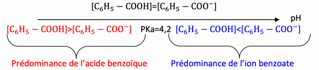 • pKA à 25°C du couple acide benzoïque C6H5–COOH(aq) / ion benzoate C6H5–COO–(aq) : 4,2.