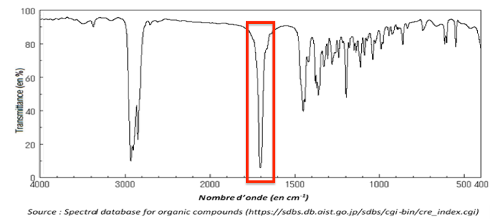 6. La séparation de la menthone du solvant extracteur se fait en réalisant une distillation. En fin d’opération on obtient une masse mexp = 10,3 g de distillat que l’on considère être de la menthone pure. On réalise le spectre infrarouge du distillat ; il est reproduit ci-après.