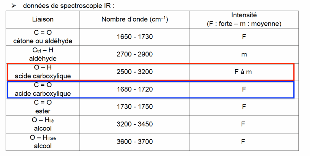 Le spectre IR obtenu comporte une bande caractéristique d’une liaison O – H d’un acide carboxylique et une bande caractéristique C = O d’un acide carboxylique. Ainsi, le spectre IR obtenu peut être celui de l’acide caprylique.