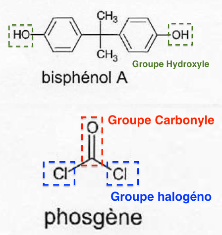 A.1. Identifier les groupes caractéristiques présents dans le bisphénol A et le phosgène.