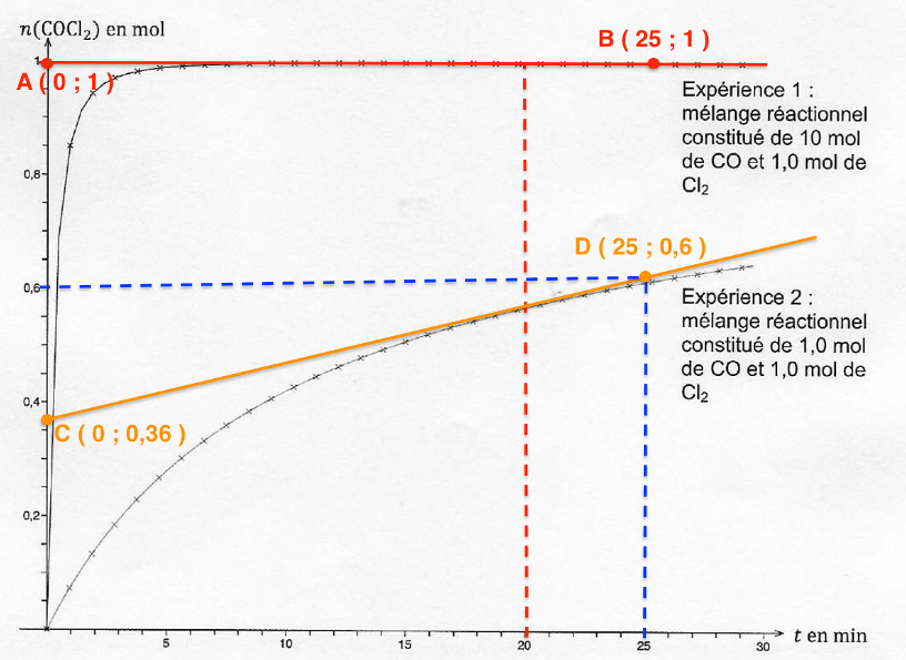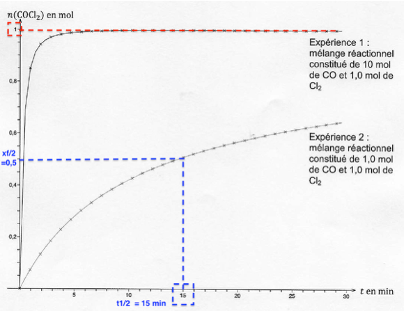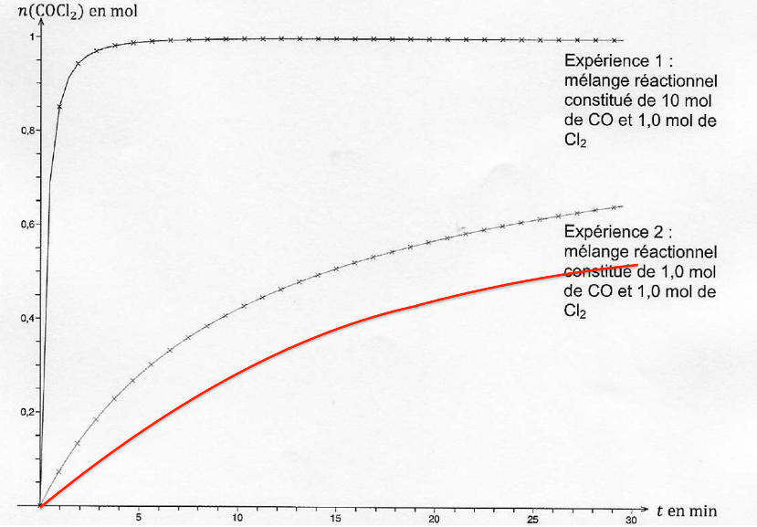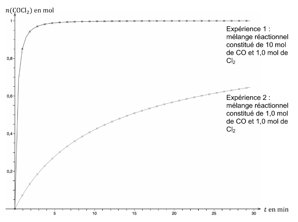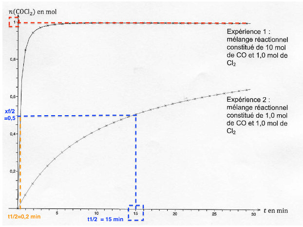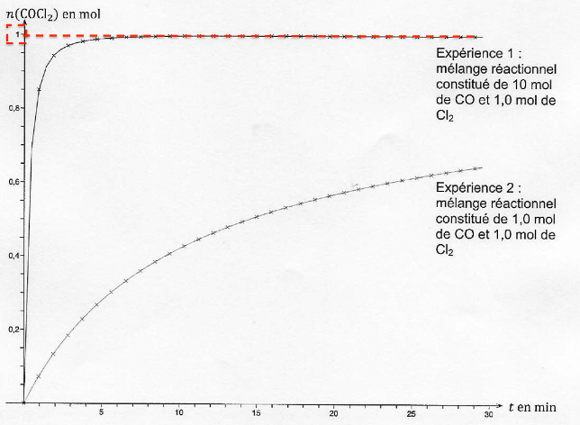 On réalise deux expériences au cours desquelles on mesure la quantité de matière de phosgène formé au cours du temps dans une enceinte de volume constant V = 30 L, à température constante T de 250 °C. Les graphiques correspondants sont donnés sur l’ANNEXE 1 À RENDRE AVEC LA COPIE (p14/15).