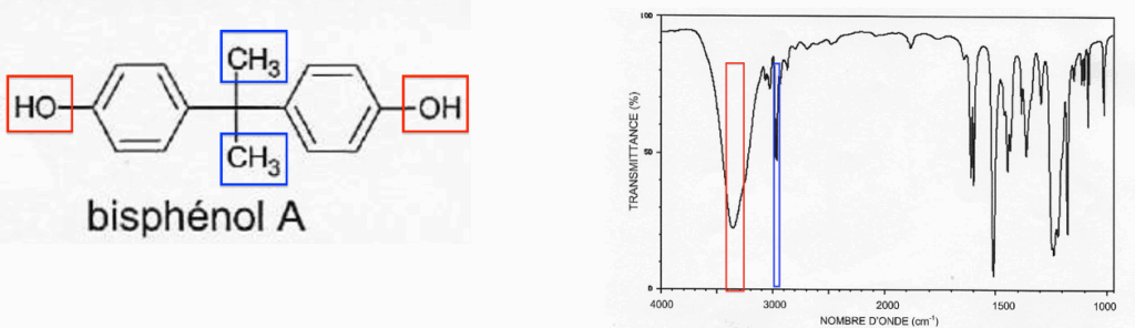 A.3.3. On donne ci-dessous le spectre du bisphénol A. Identifier les liaisons du bisphénol A responsables des bandes d’absorption à 3300 cm-1 et 2950 cm-1.