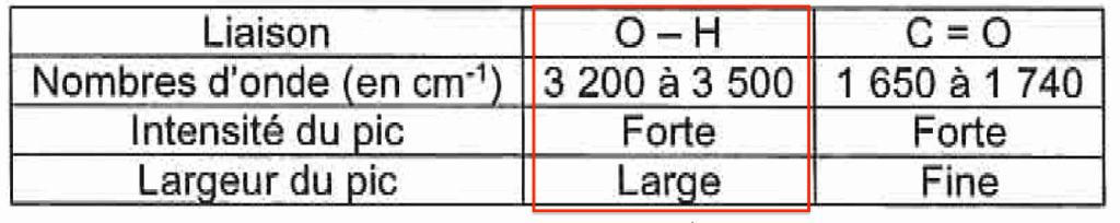 | Nombres d’onde (en cm-1) | 3 200 à 3 500 | 1 650 à 1 740 |