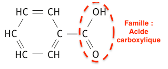 Q1. Représenter la formule semi-développée de l’acide benzoïque, entourer le groupe caractéristique et identifier la famille fonctionnelle correspondante.