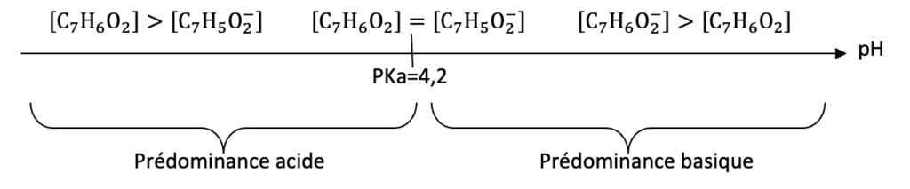 D’après le diagramme de prédominance ${{C_7H}_5O}_2^-$, l’ion benzoate, est prédominant.