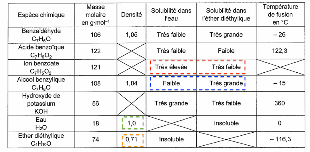 | Espèce chimique | Masse molaire en g∙mol–1 | Densité | Solubilité dans l’eau | Solubilité dans l’éther diéthylique | Température de fusion en °C |