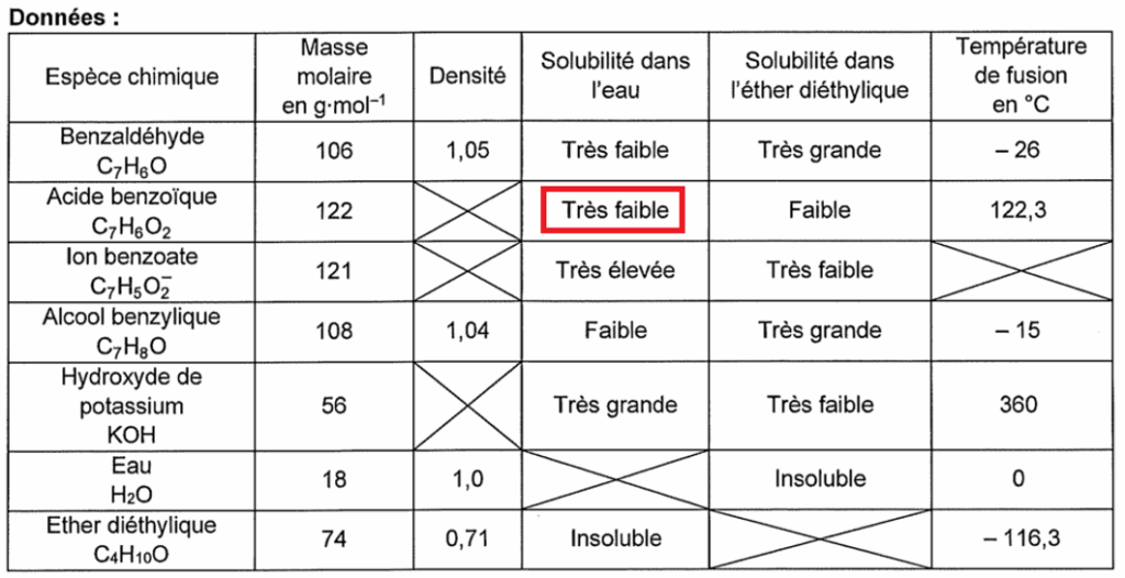 On donne ci-dessous un protocole expérimental permettant d’obtenir l’acide benzoïque par la réaction de Cannizzaro.