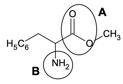 10. Nommer les groupes caractéristiques A et B entourés sur la figure 4. Pour la suite de l’exercice, on note la phénylalanine méthylée R-N̅H2.