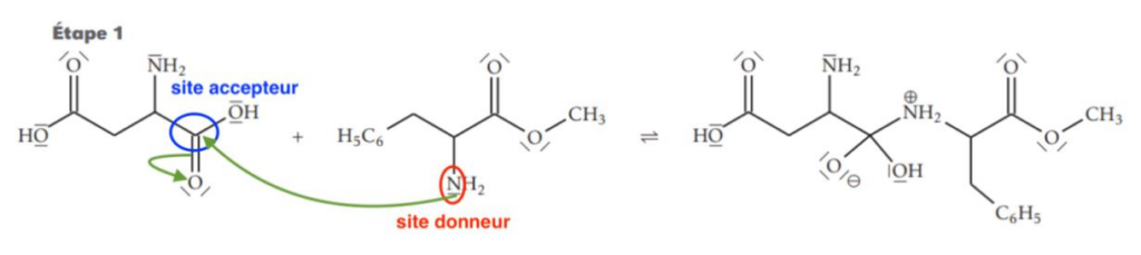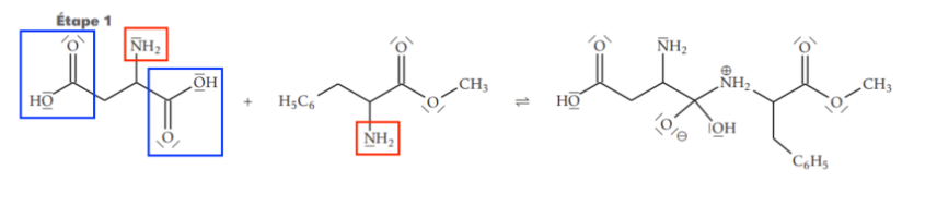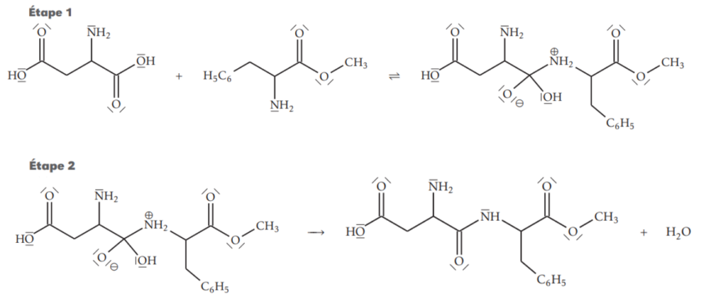 Lors de la formation de l’aspartame, la fonction acide carboxylique réagit avec fonction amine et il se forme une liaison amide.