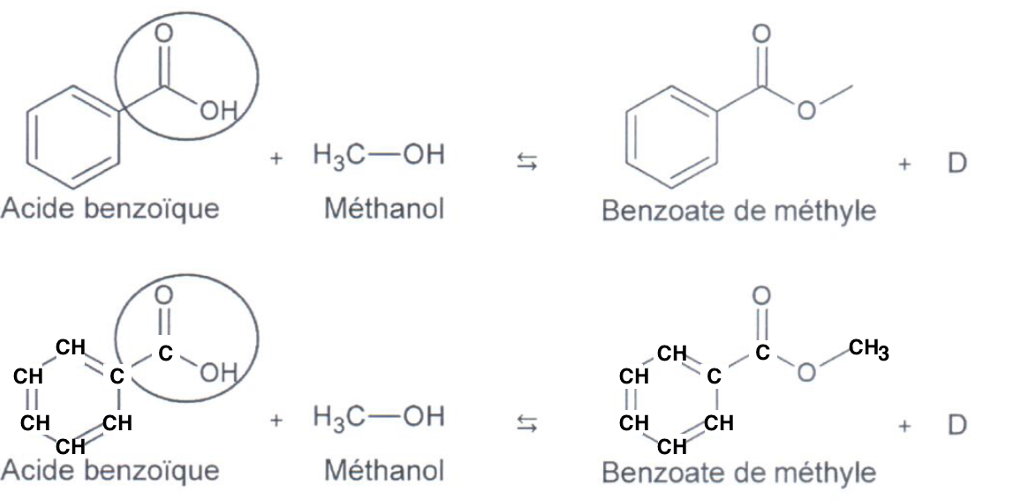 L’ester est synthétisé à partir d’acide benzoïque et de méthanol. L’équation de la réaction modélisant cette transformation chimique est donnée ci-dessous.