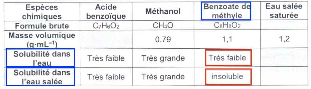 Le produit à extraire : le benzoate de méthyle est très faiblement soluble dans l’eau mais insoluble dans l’eau salée.