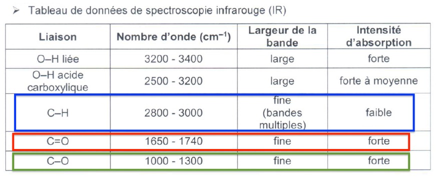| Liaison | Nombre d’onde (cm–1) | Largeur de la bande | Intensité d’absorption |