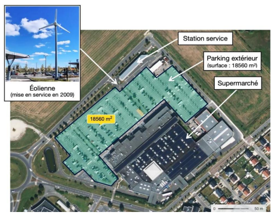 Exploité par une célèbre enseigne de la grande distribution, on estime que le supermarché de la commune a besoin de 4500 MWh d’électricité en moyenne chaque année pour fonctionner. La figure 1 présente une photographie aérienne de la zone.