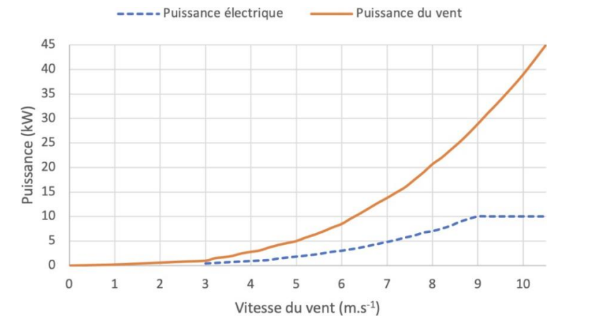 Document 2 – Graphique présentant la puissance électrique réellement produite par l’éolienne et celle du vent, chacune en fonction de la vitesse du vent
