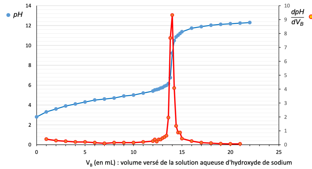 Un vinaigre commercial à 8 % est une solution aqueuse d’acide éthanoïque de formule CH3COOH contenant 8 g d’acide éthanoïque pour 100 g de solution. Pour vérifier la valeur de ce pourcentage, appelé pourcentage massique, on réalise un dosage par titrage à l’aide d’un suivi pH-métrique. La solution commerciale est diluée 10 fois. On obtient une solution notée S dont on prélève 10,0 mL que l’on titre par une solution aqueuse d’hydroxyde de sodium de concentration CB égale à 0,10 mol·L-1.